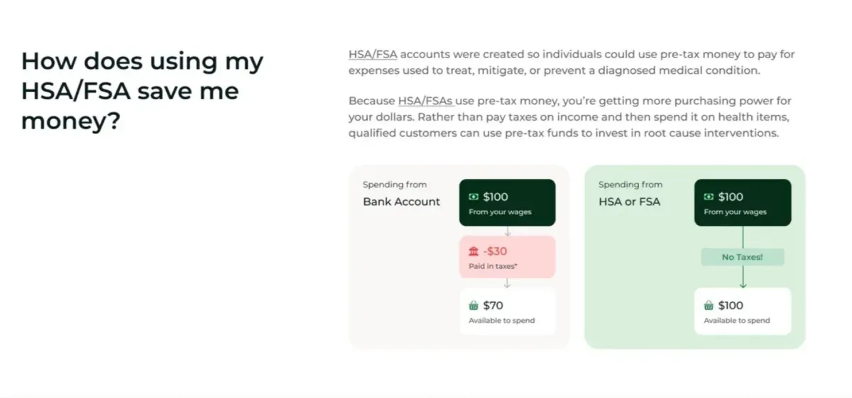 HSA/FSA accounts were created so individuals could use pre-tax money to pay for expenses used to treat, mitigate, or prevent a diagnosed medical condition. Because HSA/FSAs use pre-tax money, you’re getting more purchasing power for your dollars. Rather than pay taxes on income and then spend it on health items, qualified customers can use pre-tax funds to invest in their health.